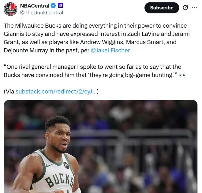 同時名記Jake Fischer曝出,雄鹿隊上下正在動用各種方式努力說服字母哥留隊,其中包括在交易截止日前大幅補強,目前雄鹿隊已經(jīng)被曝盯上拉文、格蘭特等球員。